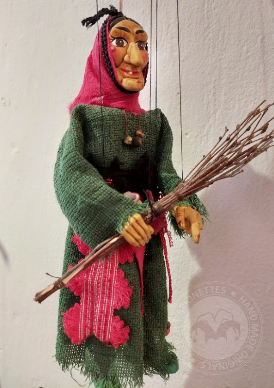 Regardez bien cette marionnette de sorcière qui symbolise le monde magique des contes de fées! Chaque détail sur elle est assorti, de sorte que sa beauté se démarque encore plus. Et comme chaque vraie sorcière a un balai, celle-ci n’est pas une exception. Elle le porte avec elle tout le temps. Son corps est taillé dans le bois à la main. La tête et les mains sont en résine moulée et son visage est soigneusement peint à la main.