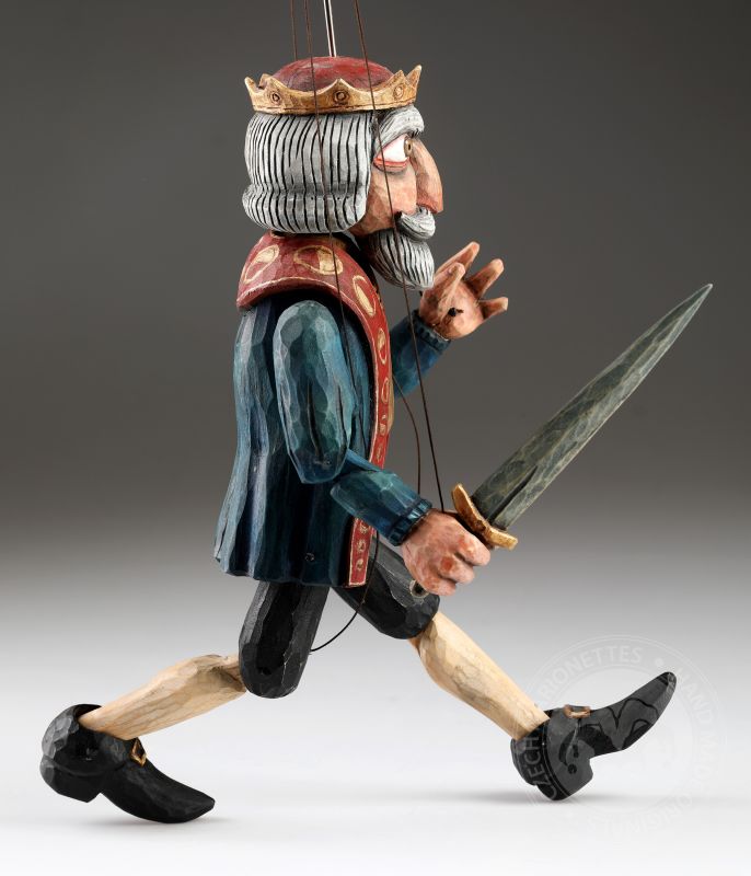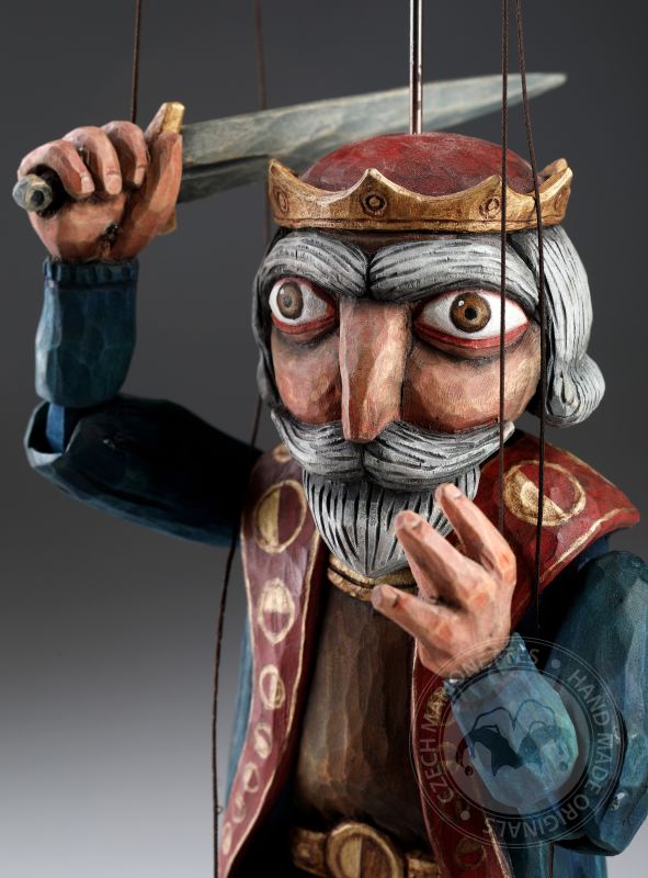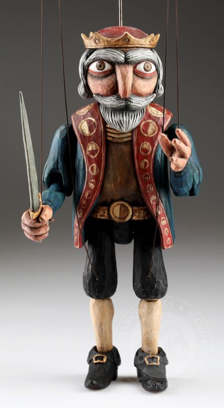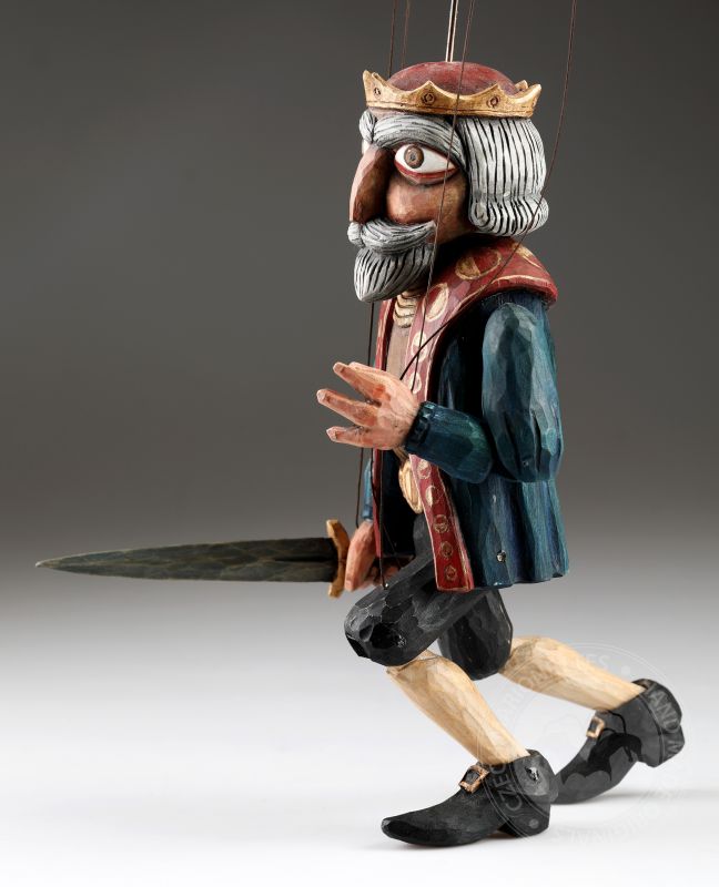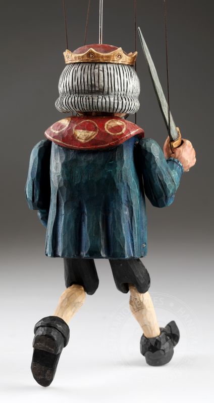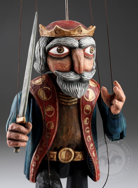 Marionnette en bois stylisée du roi sculptée dans un style rétro - inspirée des marionnettes anciennes tchèques