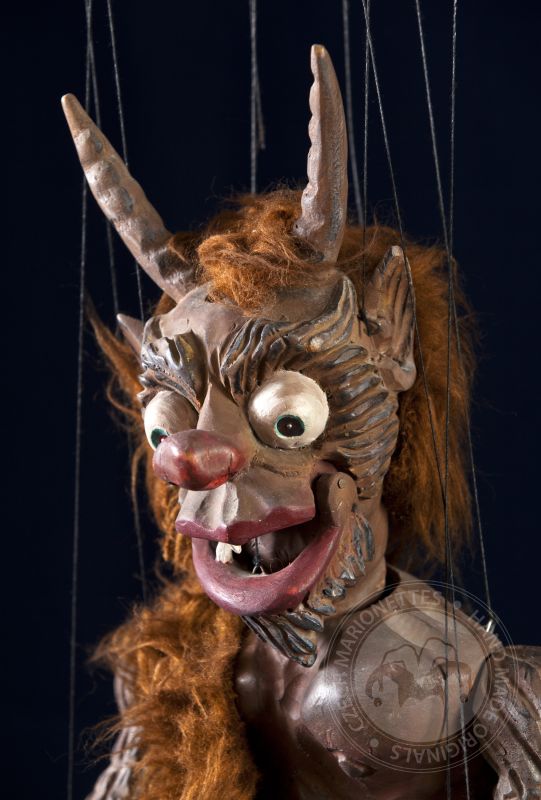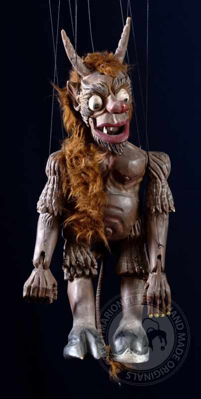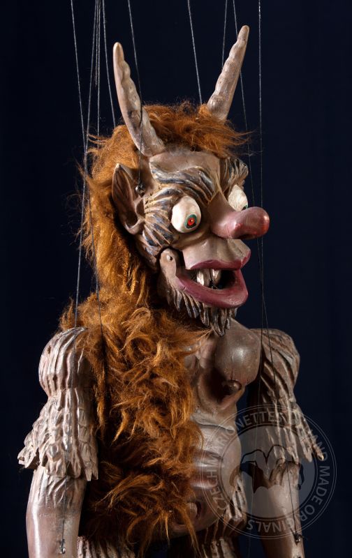 Cette marionnette est vraiment unique. Son corps entier est sculpté en détail dans du bois de tilleul et le seul ornement textile qu'elle porte est un manteau de fourrure, censé représenter les poils qui poussent sur le corps du diable. Un morceau de fourrure pousse également à partir de sa queue, avec laquelle le diable est souvent représenté. Son originalité est renforcée par sa mâchoire mobile et ses grands yeux globuleux. En bref, un original qui ravira tout amateur de marionnettes.