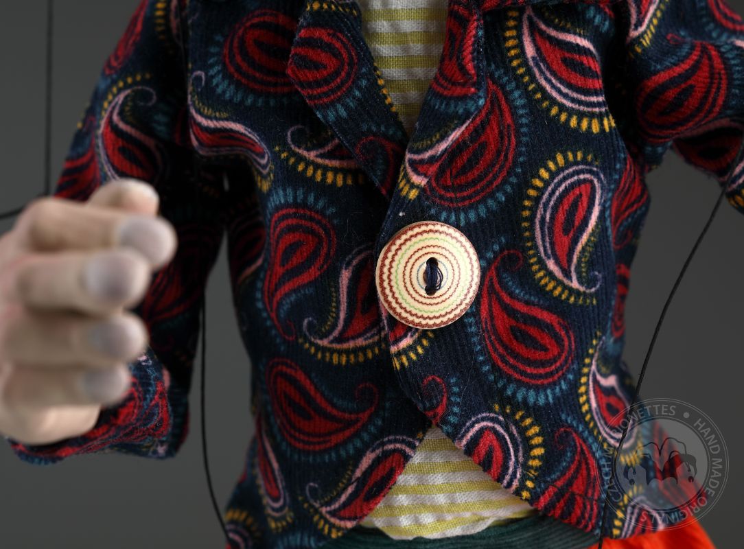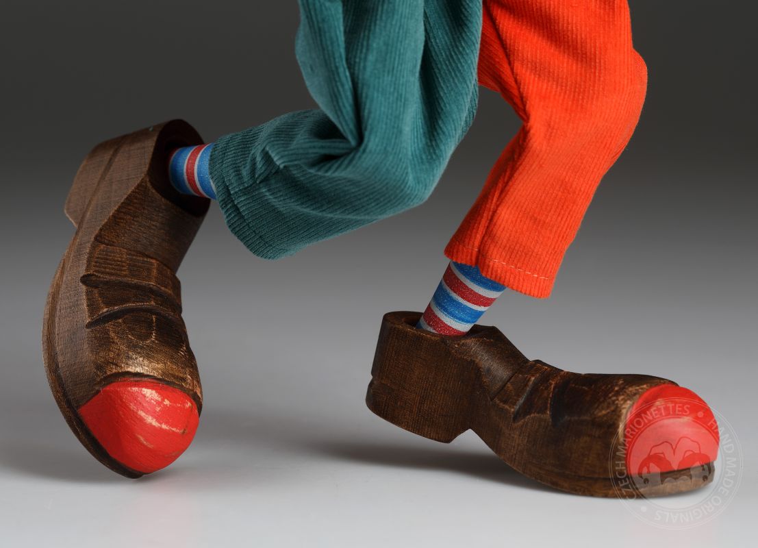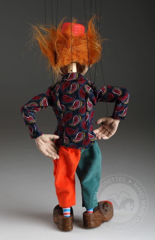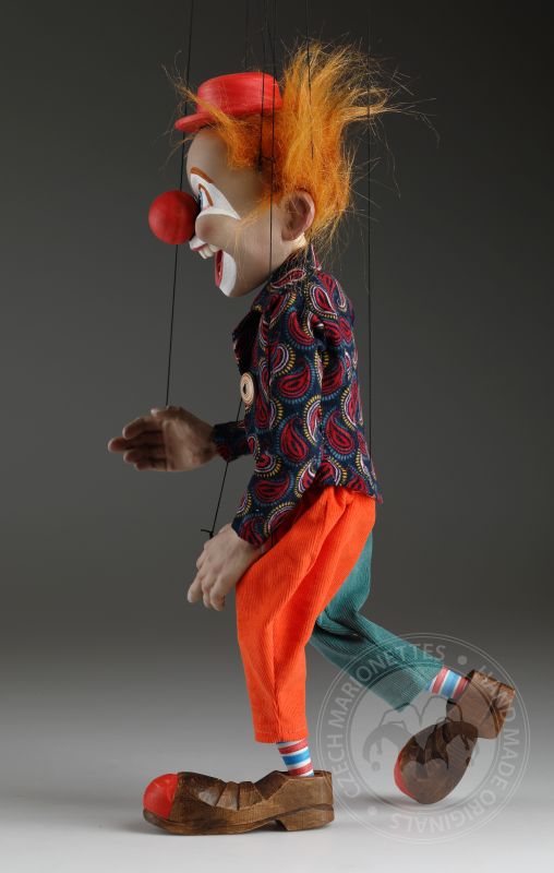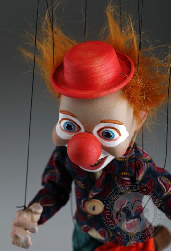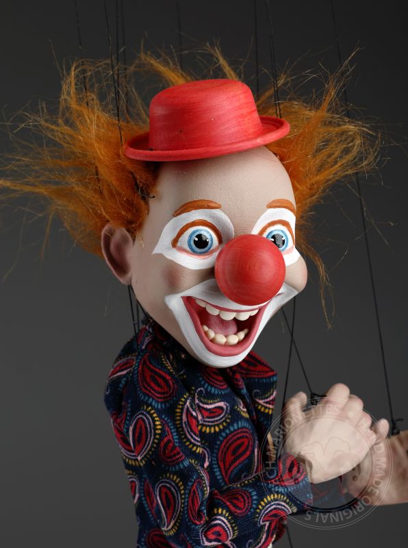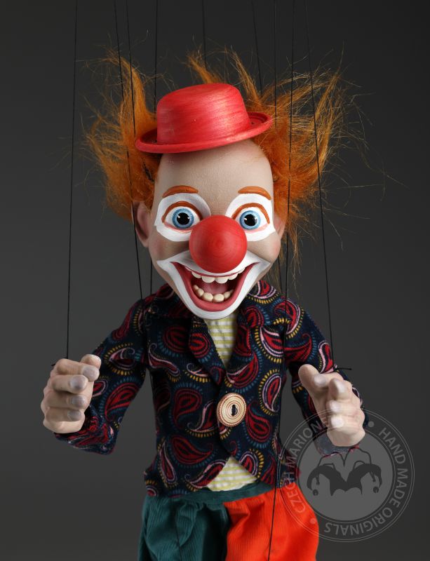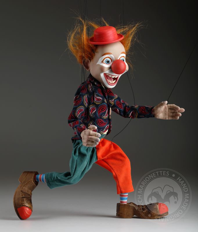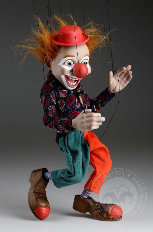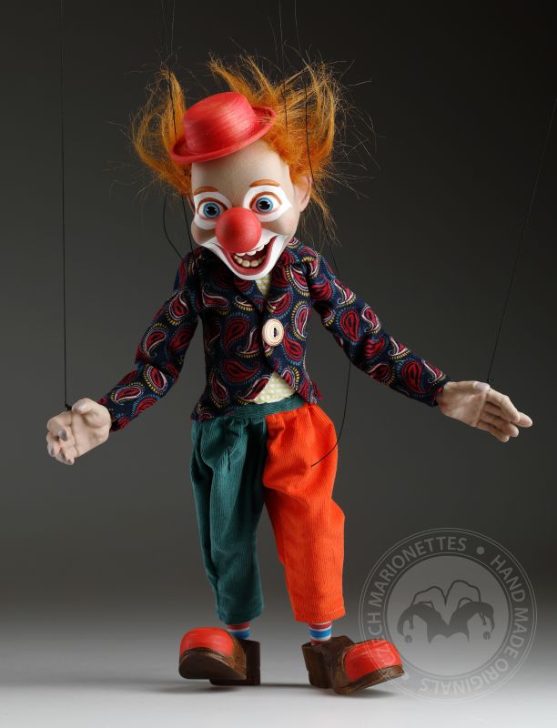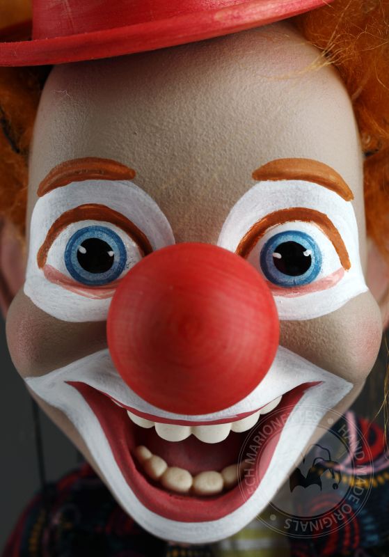 Son visage est peint à la main et la robe est faite sur mesure. Un bouton géant sur une veste colorée et un pantalon multicolore ne font que compléter l'apparence joyeuse et amicale d'un clown au chapeau melon rouge, qui laisse échapper une poignée de rires. Cette marionnette est élaborée dans les moindres détails, parfaitement équilibrée et mobile et a un charme et un charme particuliers.
