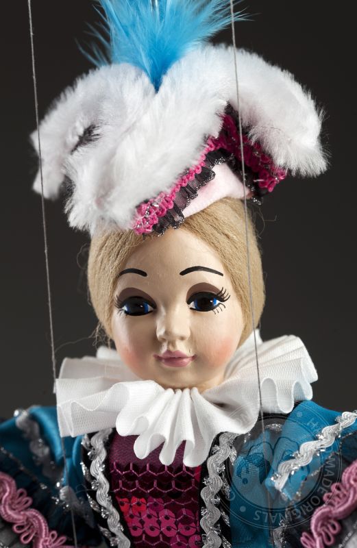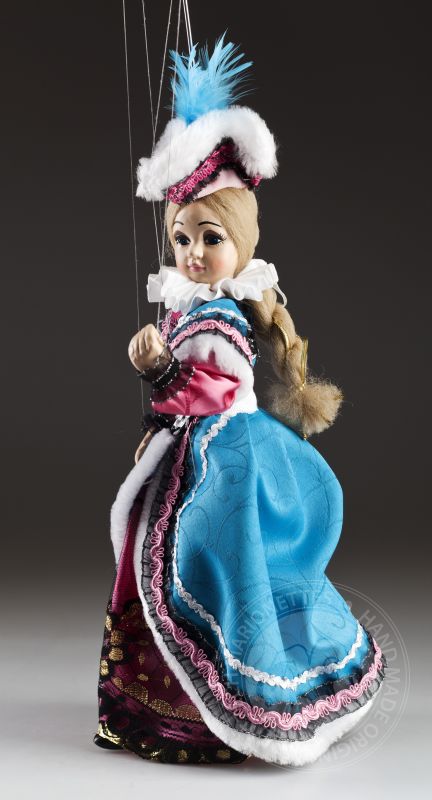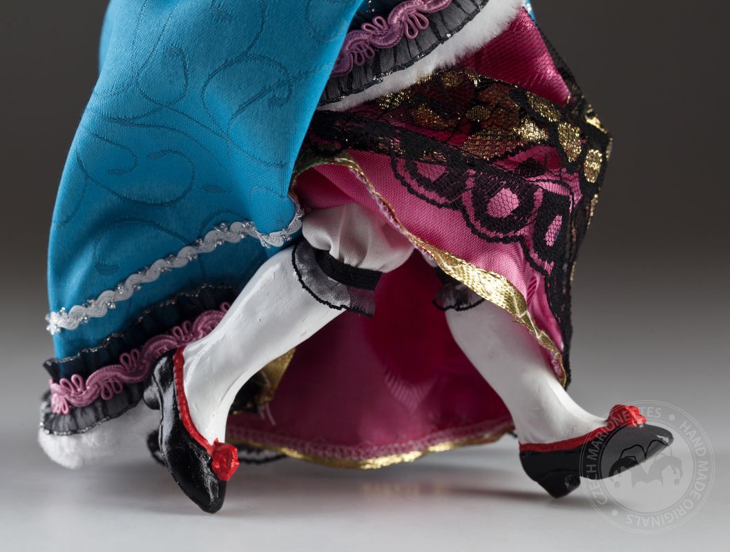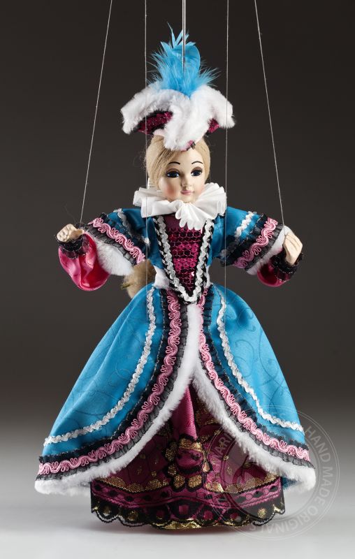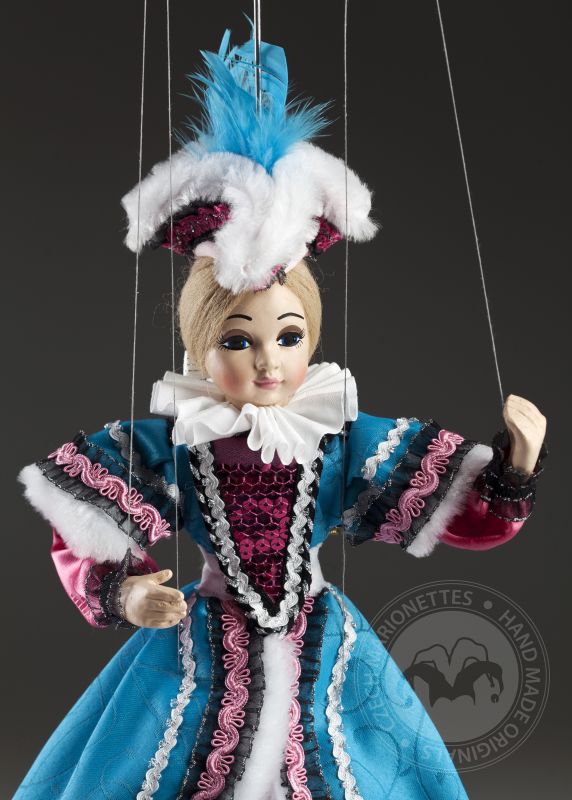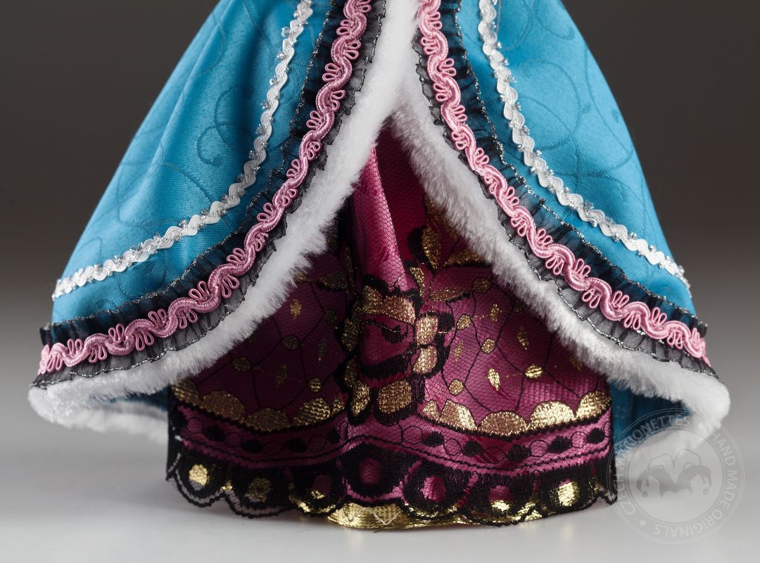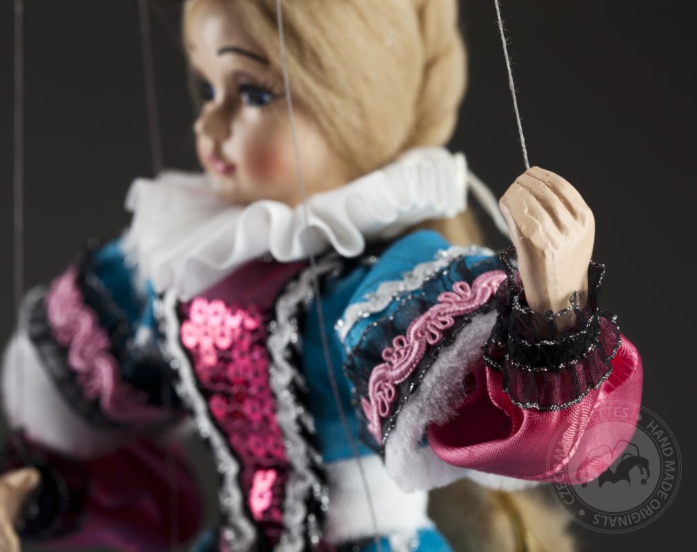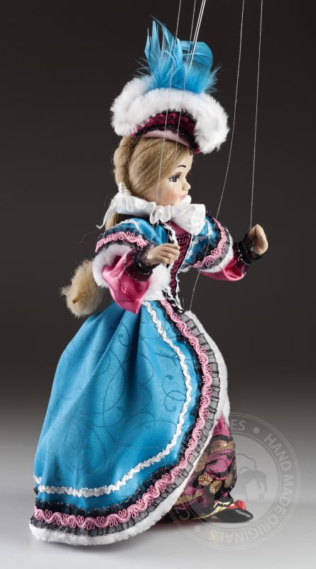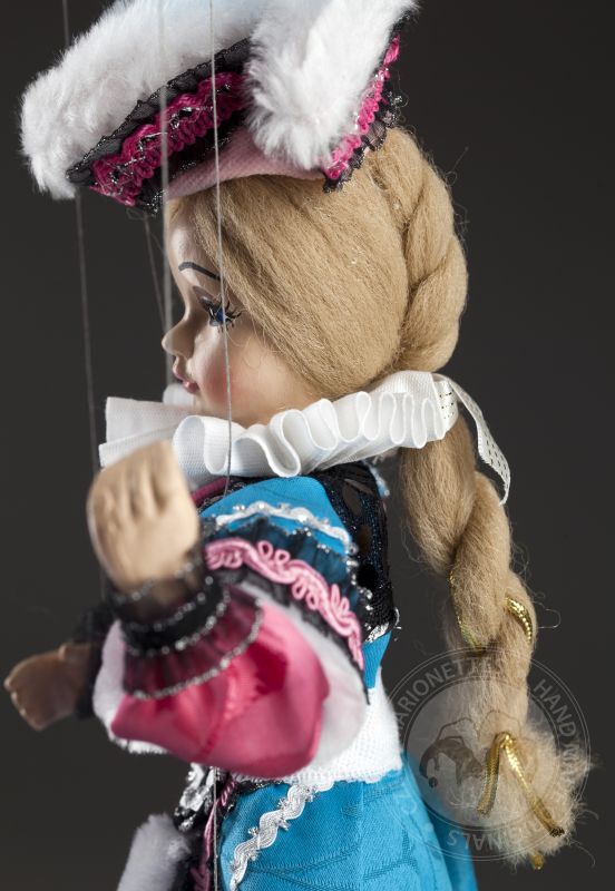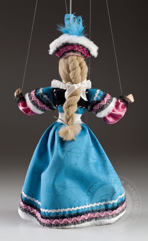 La petite comtesse a l'air irrésistible! Clara est une vraie dame. Il peut toujours s'habiller parfaitement et assortir magnifiquement les accessoires. Ses cheveux sont attachés dans une tresse appropriée et son maquillage est à la dernière mode. La robe est faite sur mesure et décorée dans les moindres détails. Si vous aimez la mode, les marionnettes décoratives et le regard doux, la marionnette de la comtesse Clara vous enchantera. Sur les photos, vous pouvez voir à quel point il est beau à l'intérieur!Des marionnettes comme la comtesse Clara sont produites en éditions limitées en quelques pièces. La tête, les bras et les jambes sont moulés et peints à la main, le corps (squelette) est en bois de tilleul. La marionnette a un contrôle traditionnel, elle est connectée au contrôleur avec un fil et des fils classiques sont utilisés pour contrôler les mains et les pieds.Jetez un œil au travail magnifique et détaillé sur un beau costume sur mesure. Il est fait de tissus de haute qualité avec un grand accent sur un traitement précis. La haute décoration est tout à fait typique de cette collection.