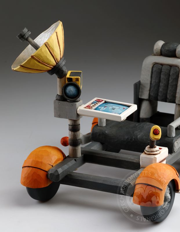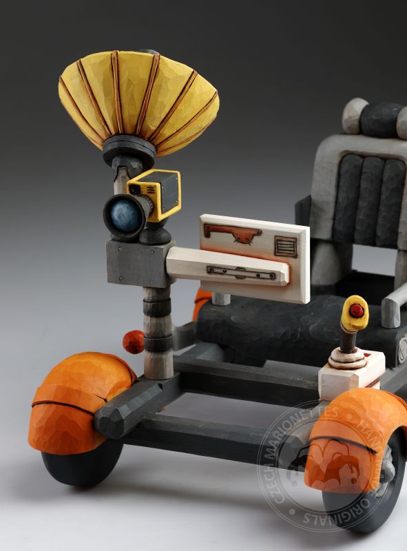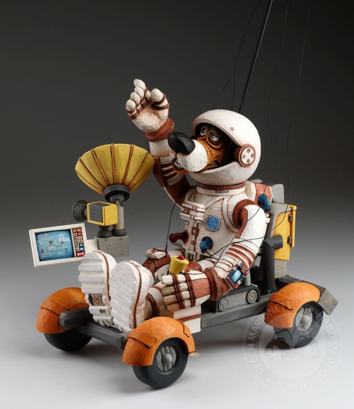 Ces gars portent l'unique ''écriture manuscrite'' de leur auteur Jakub Fiala. Chaque chien est précisément sculpté à la main dans le bois de tilleul dans les moindres détails. Vous pouvez voir des combinaisons spatiales magnifiquement sculptées et peintes, des expressions faciales impressionnantes et une palette de couleurs incroyable. En plus de cela, ils ont une super voiture spatiale qui est également faite à la main pour correspondre à leurs tenues.