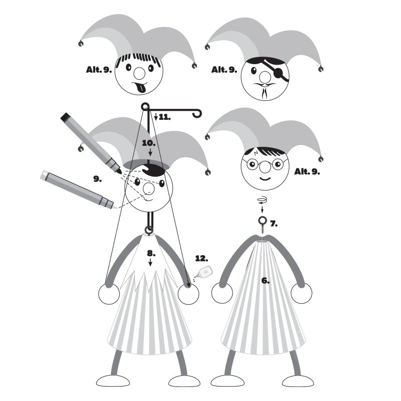 Le sentiment de faire quelque chose par soi-même n'a pas de prix. Soyez créatif et créez votre propre petite marionnette de bouffon. Ce kit contient toutes les pièces dont vous avez besoin pour construire la marionnette. Corps, tête, mains et pieds en bois, tissu pour vêtements, cordes, contrôleur, fil et manuel. Quoi d'autre est nécessaire? Une aiguille, de la super colle ou un pistolet à colle chaude et un marqueur noir pour peindre le visage. Vous pouvez ajouter des couleurs, changer le tissu, dessiner des expressions faciales amusantes... Tout dépend de vous. Amusez-vous, soyez arty.