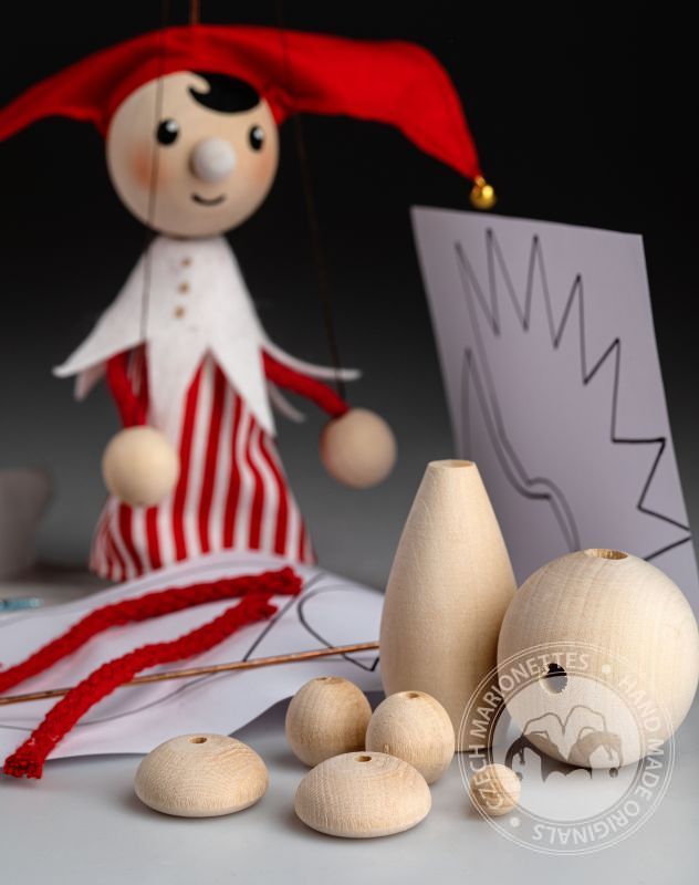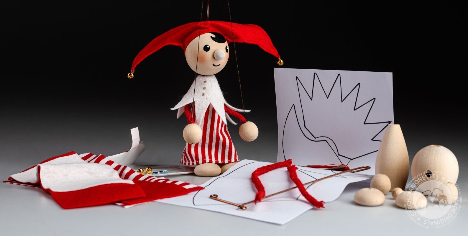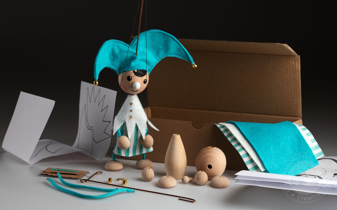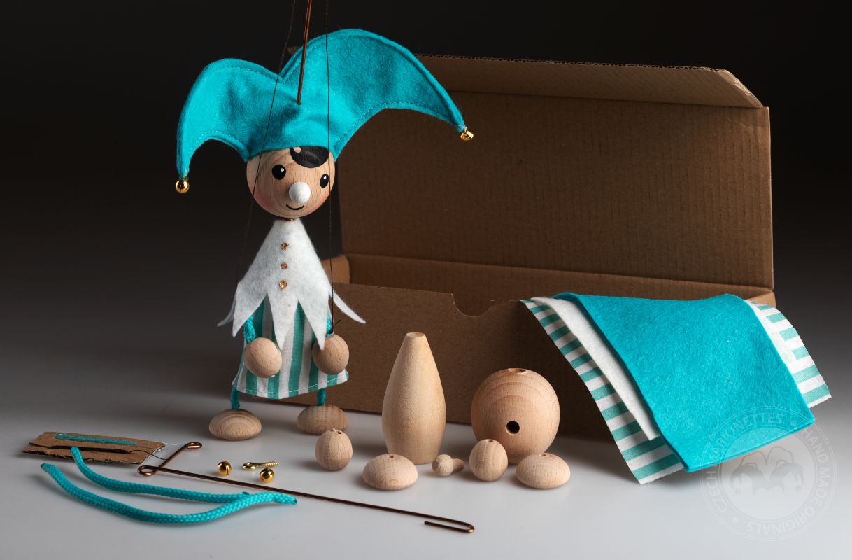 Chaque kit de bricolage contient des parties du corps en bois de la marionnette, du contrôleur, des cordes, du tissu et des manuels pour fabriquer le costume et assembler la marionnette. De quoi d'autres avez-vous besoin? Une aiguille, de la super glue ou un pistolet à colle et un feutre noir pour peindre le visage. Cependant, vous pouvez créer vos propres vêtements, décorer et peindre le bouffon comme vous le souhaitez.