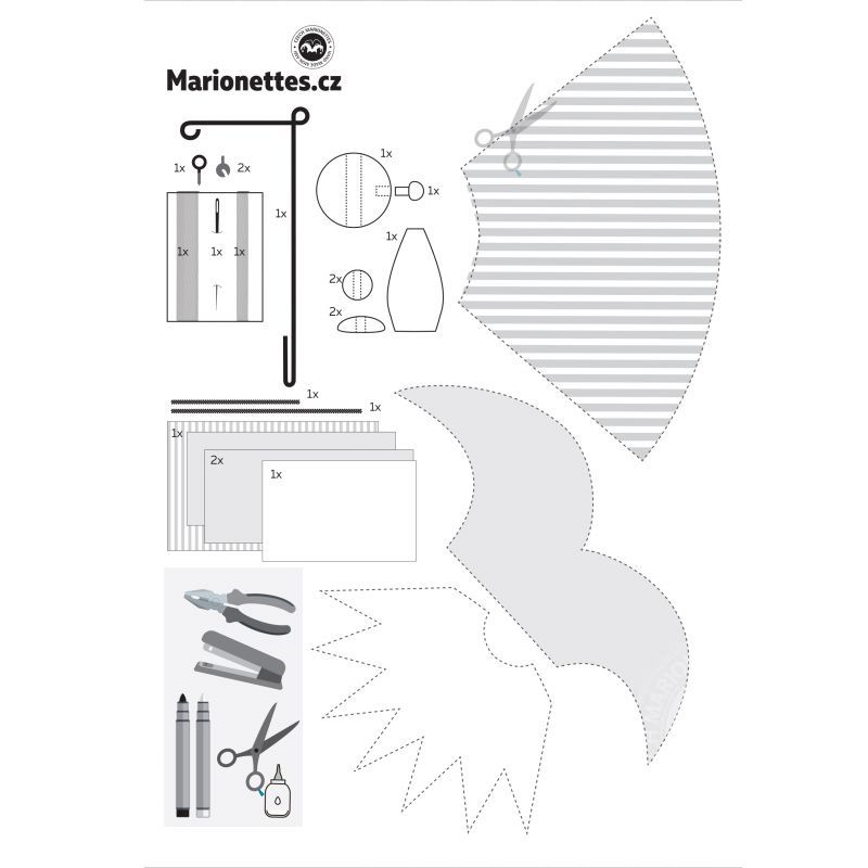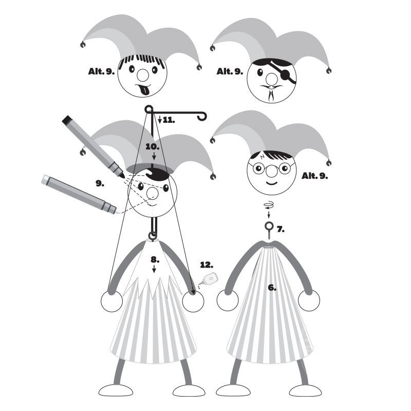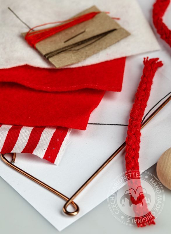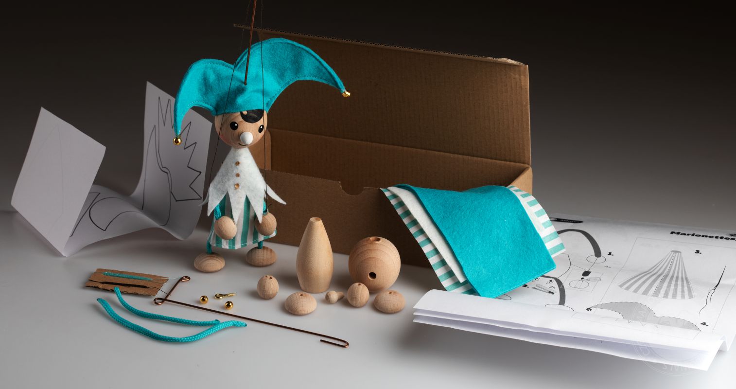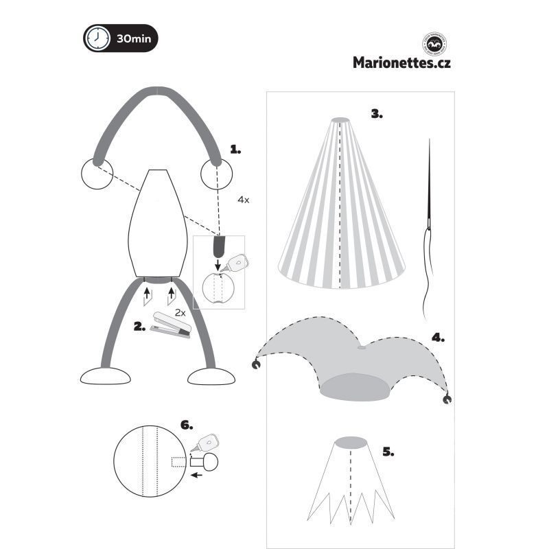 Chaque kit de bricolage contient des parties du corps en bois de la marionnette, du contrôleur, des cordes, du tissu et des manuels pour fabriquer le costume et assembler la marionnette. De quoi d'autres avez-vous besoin? Une aiguille, de la super glue ou un pistolet à colle et un feutre noir pour peindre le visage. Cependant, vous pouvez créer vos propres vêtements, décorer et peindre le bouffon comme vous le souhaitez.