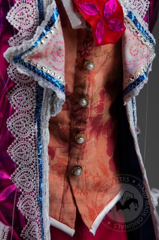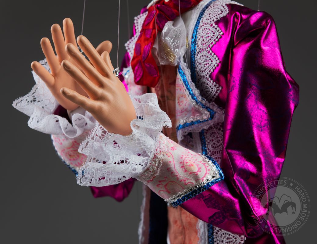Drosselmeyer a un costume magnifiquement fait avec une grande attention aux détails. Vous pouvez voir différents matériaux comme la dentelle et les couleurs vibrantes se démarquent. Son visage est peint à la main d'une manière qui ressemble au maquillage d'un vrai acteur. Cette marionnette est un chef-d'œuvre époustouflant qui brillera sur toutes les scènes de théâtre.