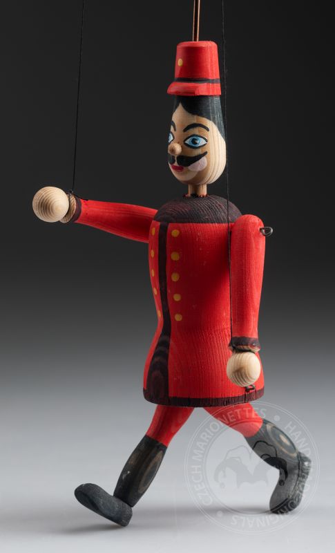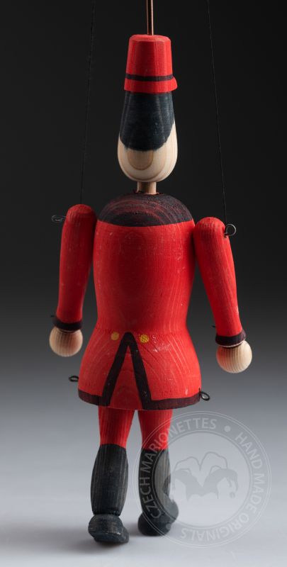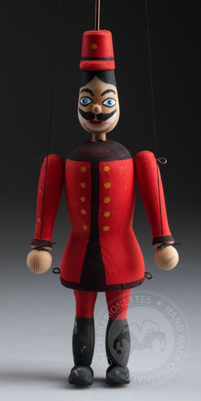 Une marionnette tchèque classique en bois - Soldat en rouge. Jolie petite marionnette pour tout le monde, surtout pour les enfants.