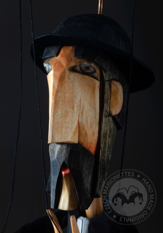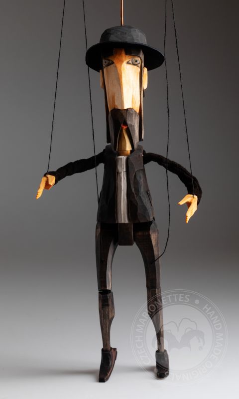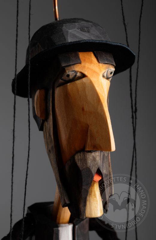 Voici un Juif pensif - une marionnette en bois sculptée à la main par Martin Kadlec dans un style original. Œuvre d'art unique parfaite comme décoration ou pièce de collection pour votre collection.