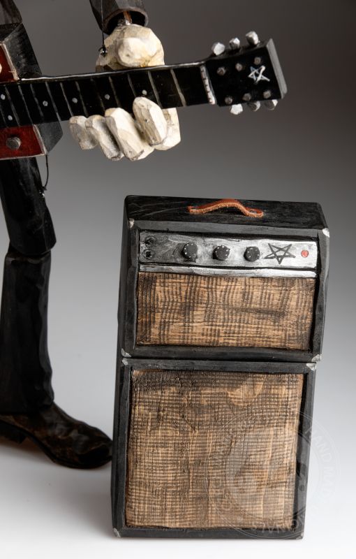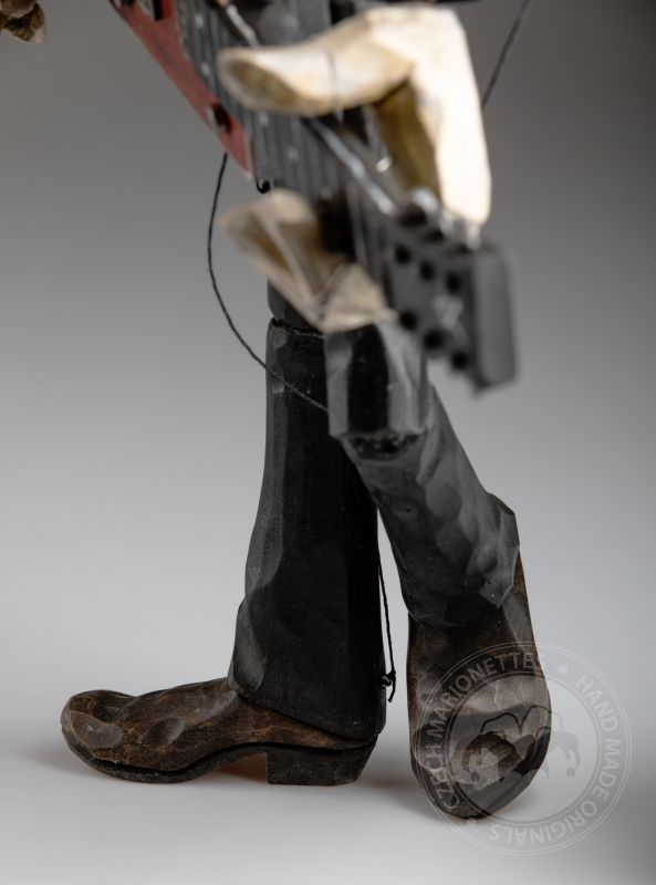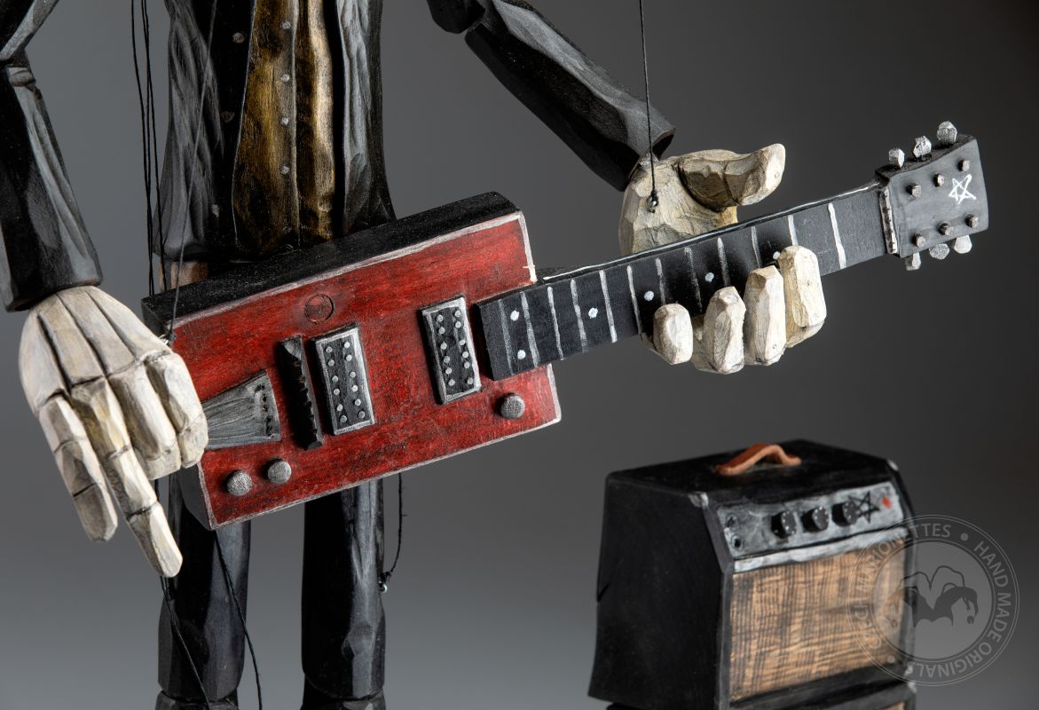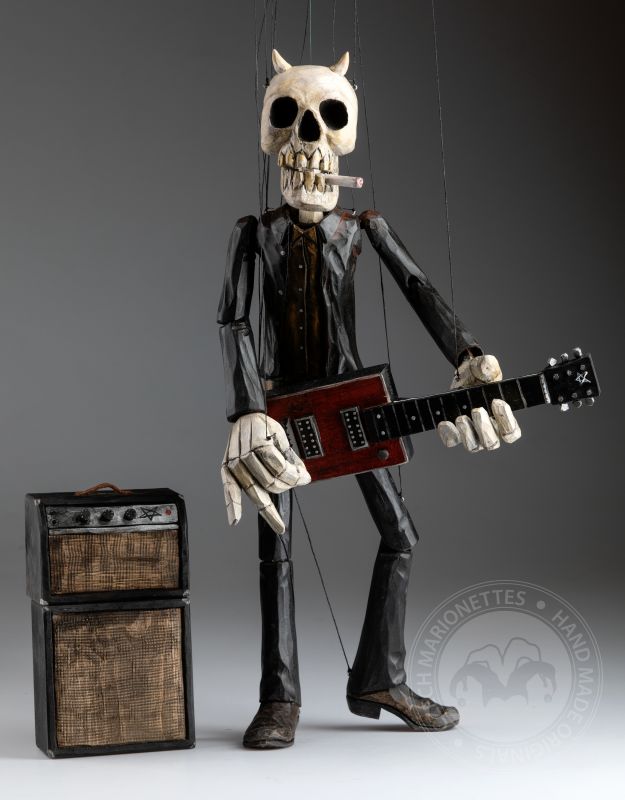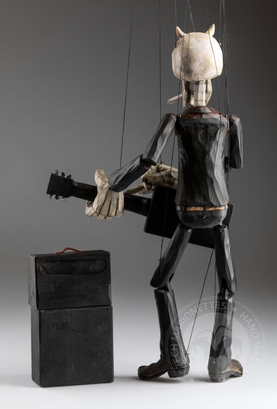 Cette marionnette est sculptée à la main dans du bois de tilleul et peinte à la main par la suite. Il vient avec une guitare et un petit ampli.