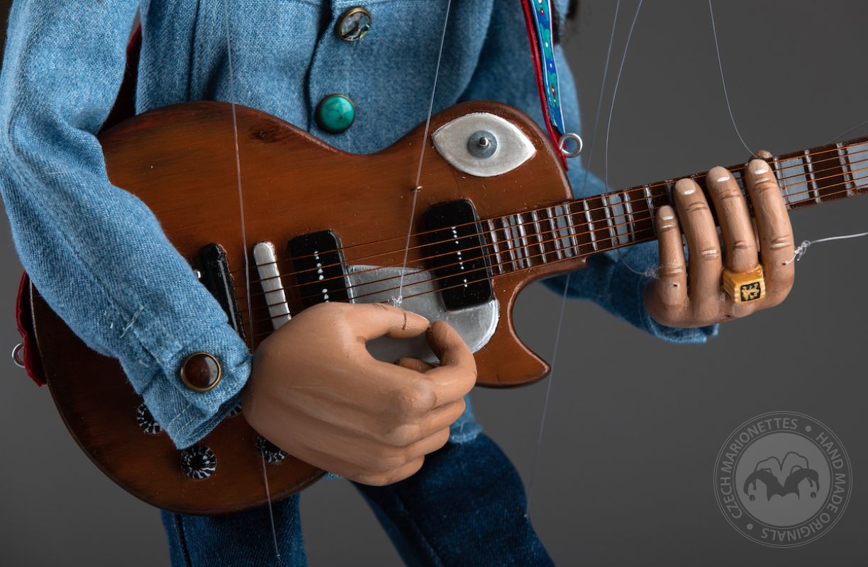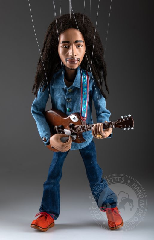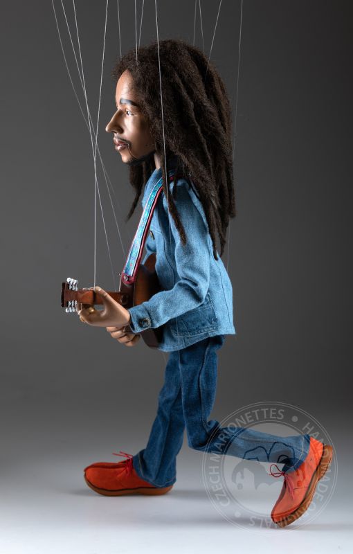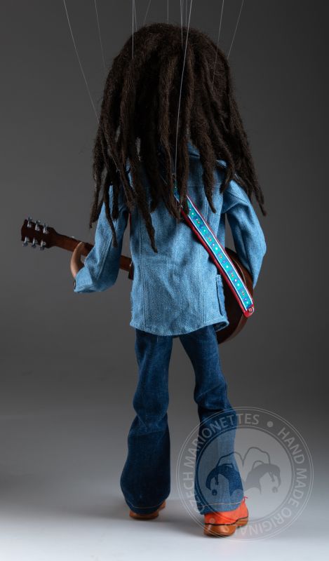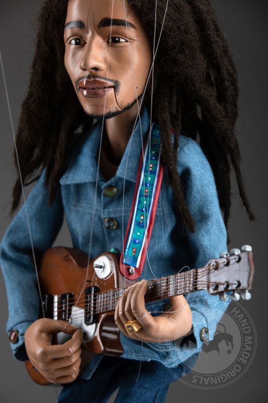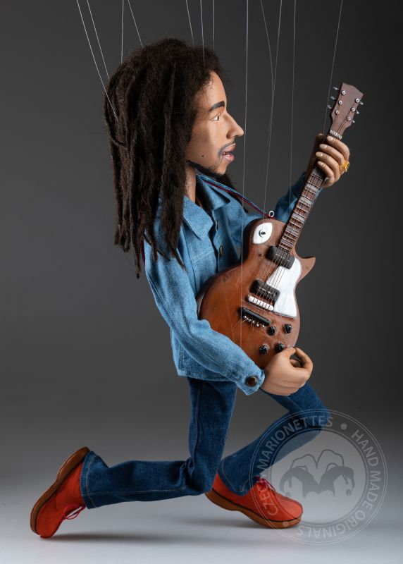 La marionnette Bob Marley est idéale pour les spectacles de rue ainsi que comme objet d'exposition. Il a une guitare authentique dont il sait jouer.