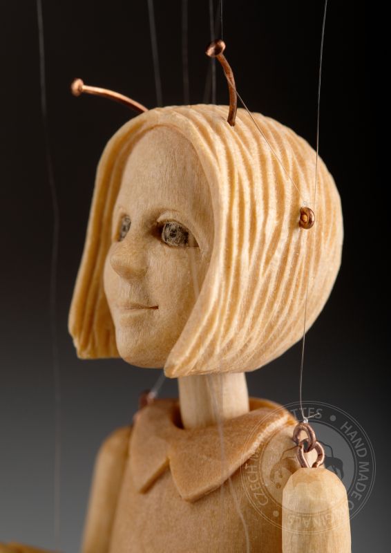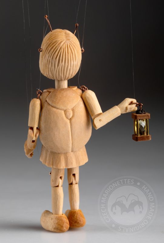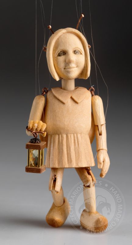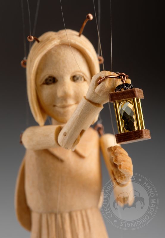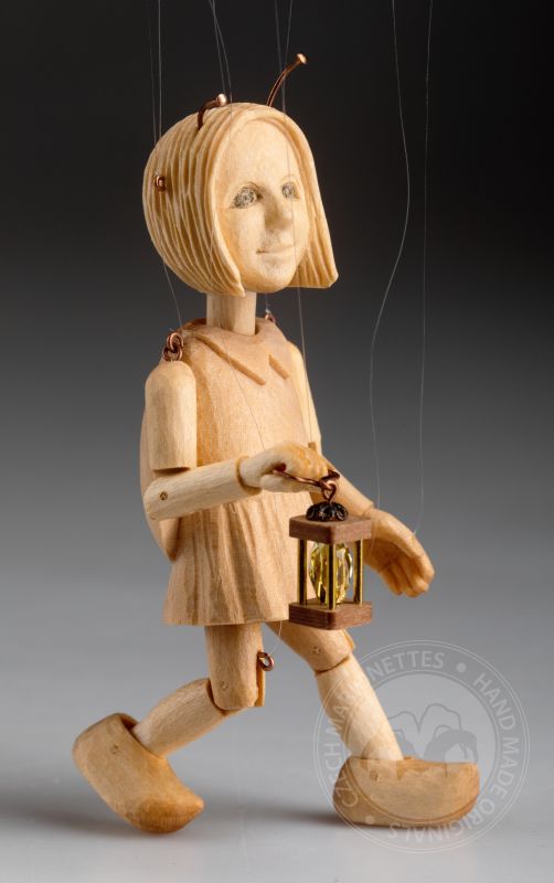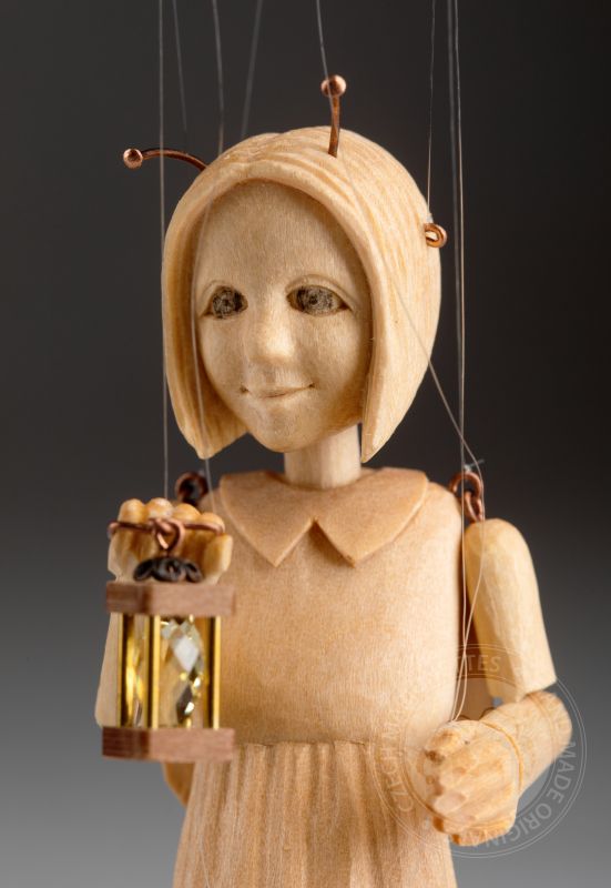 Notre marionnette en bois sculptée à la main représentant un petit insecte est tout simplement à couper le souffle. Cette marionnette est si petite et pourtant pleine de détails étonnants. Vous pouvez remarquer une petite lanterne avec une perle de verre à l'intérieur représentant une lumière ou de minuscules antennes sur sa tête. Cette marionnette est soigneusement sculptée à la main dans du bois de tilleul et malgré sa taille, elle peut très bien se déplacer ! C’est véritablement une œuvre d’art montrant la beauté du métier de fabrication de marionnettes.