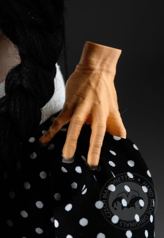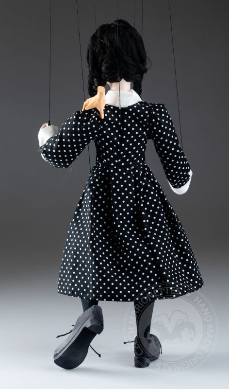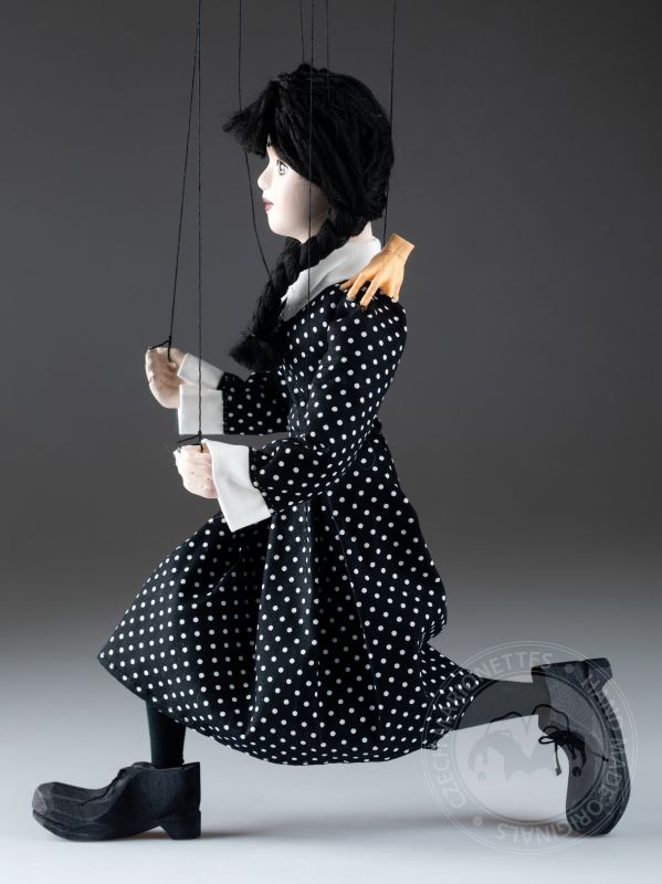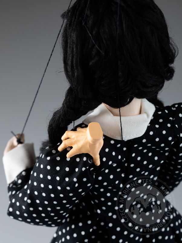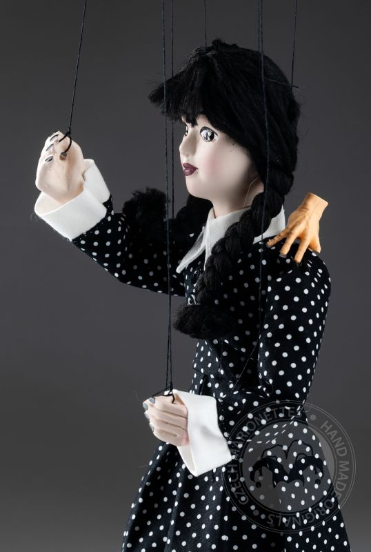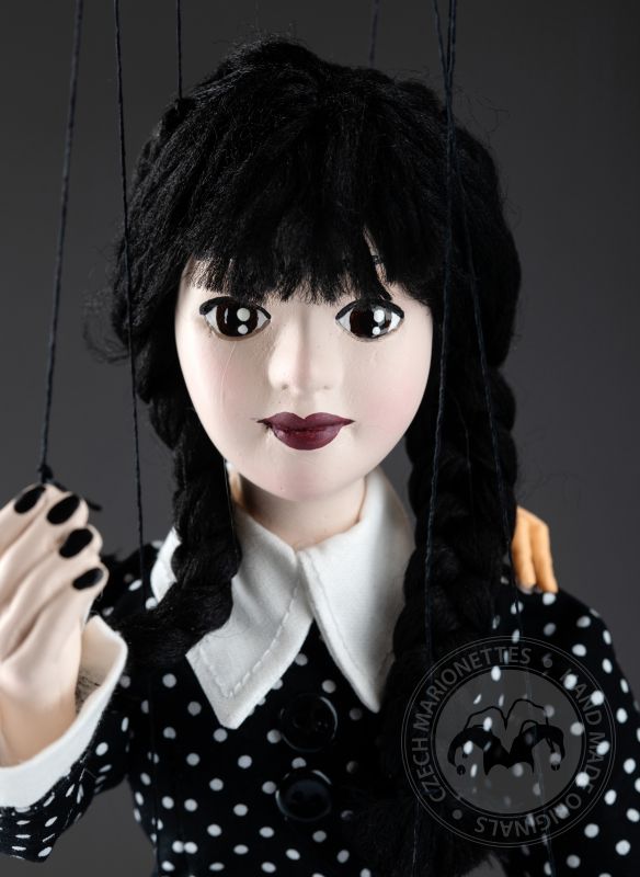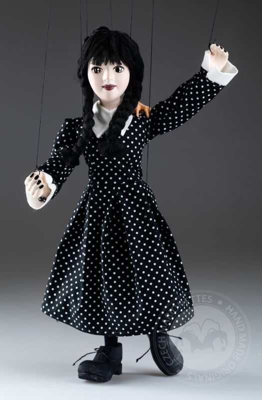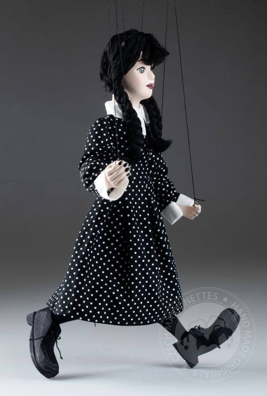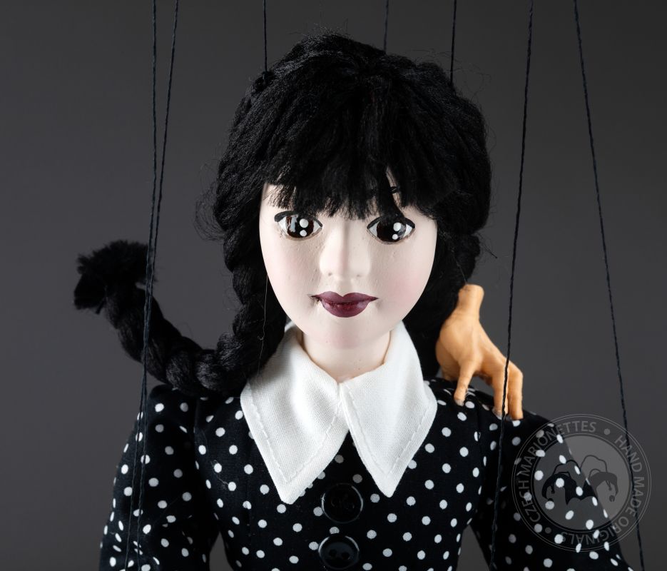 Nous vous présentons notre marionnette Wednesday Addams, inspirée par le personnage emblématique de la série Wednesday! Cette marionnette artisanale capture le charme unique et le style gothique de Wednesday, avec sa célèbre robe à pois noir et blanc, ses tresses et son expression sombre.