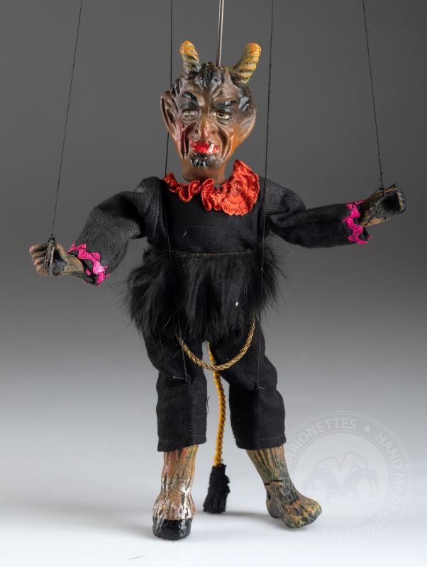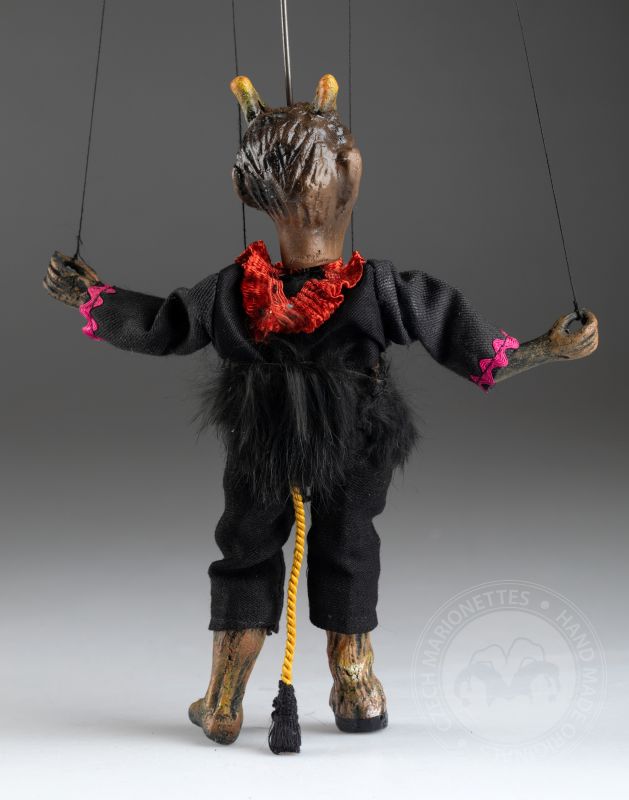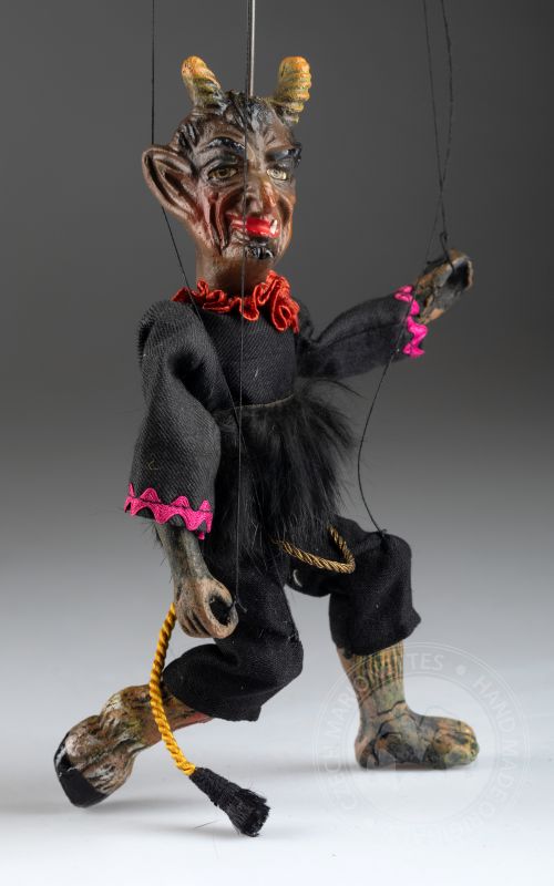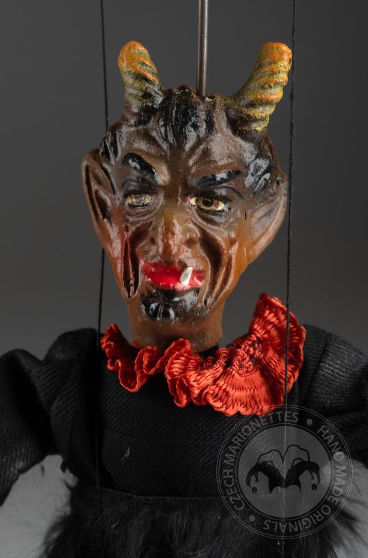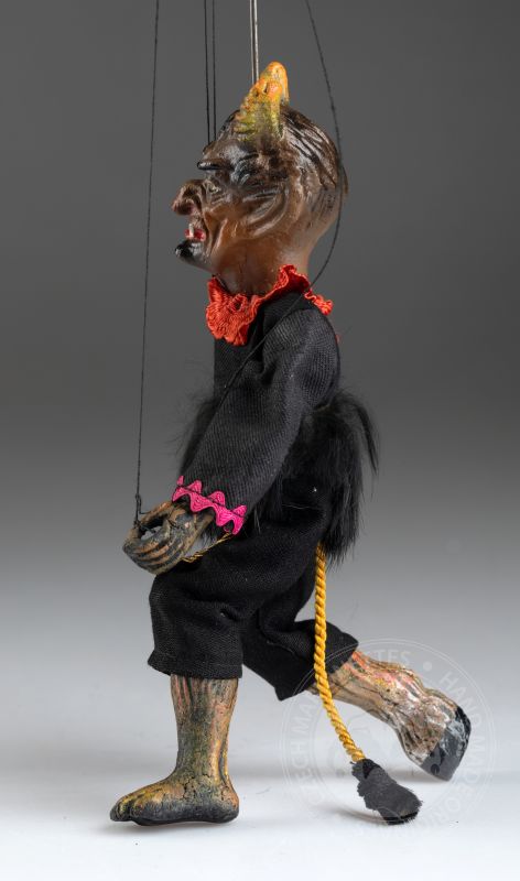 Chaque détail a été soigneusement réalisé, y compris la chaîne qui pend de sa ceinture et les sabots distinctement peints. Cette marionnette du diable n'est pas seulement un jouet, mais une pièce de collection authentique qui apporte la magie de la tradition tchèque et de l'artisanat dans tout intérieur.