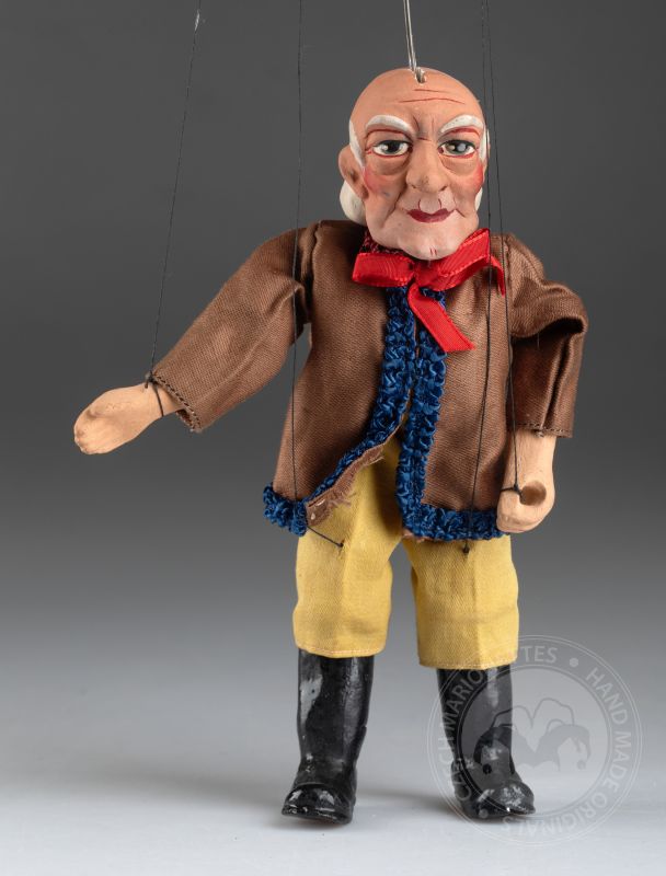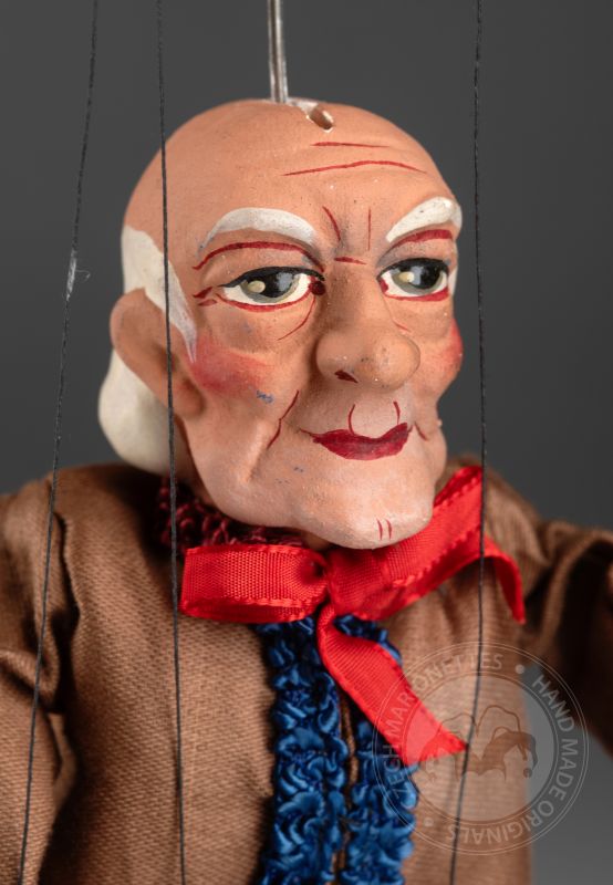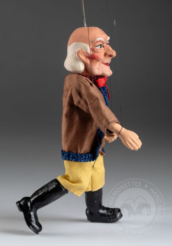 Le visage de la marionnette est soigneusement peint à la main avec des traits expressifs qui capturent la sagesse et le calme d'un propriétaire terrien rural. Chaque détail a été créé avec amour et précision pour donner vie à cette marionnette et évoquer l'atmosphère de la culture folklorique tchèque.