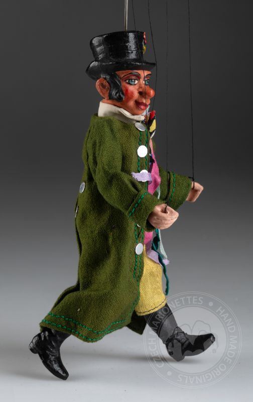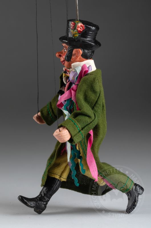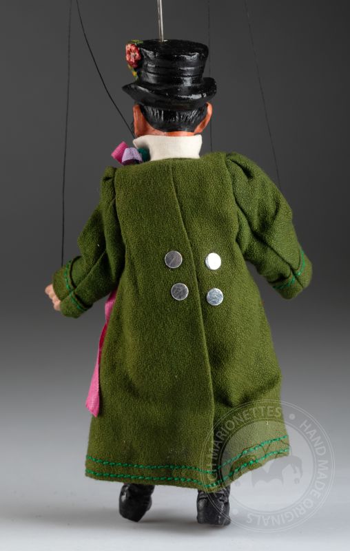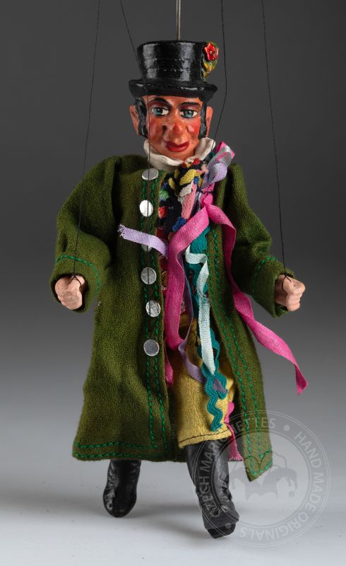 Cette marionnette antique du cocher est un superbe exemple du théâtre de marionnettes tchèque traditionnel, mêlant histoire et artisanat méticuleux. Le cocher est vêtu d'un manteau vert frappant, orné de détails brodés à la main et de rubans colorés, ajoutant une élégance unique et une touche ludique à la marionnette. Son haut-de-forme noir avec un motif floral sur le côté complète parfaitement son personnage et souligne son rôle de maître du carrosse.