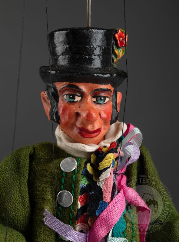Son visage, délicatement peint avec des traits marqués, y compris des joues rosées et un sourire amical, capture la personnalité joyeuse de ce personnage. Chaque détail, des vêtements aux mains finement sculptées, a été réalisé avec amour et soin pour transmettre la joie et le charme du théâtre de marionnettes traditionnel.
