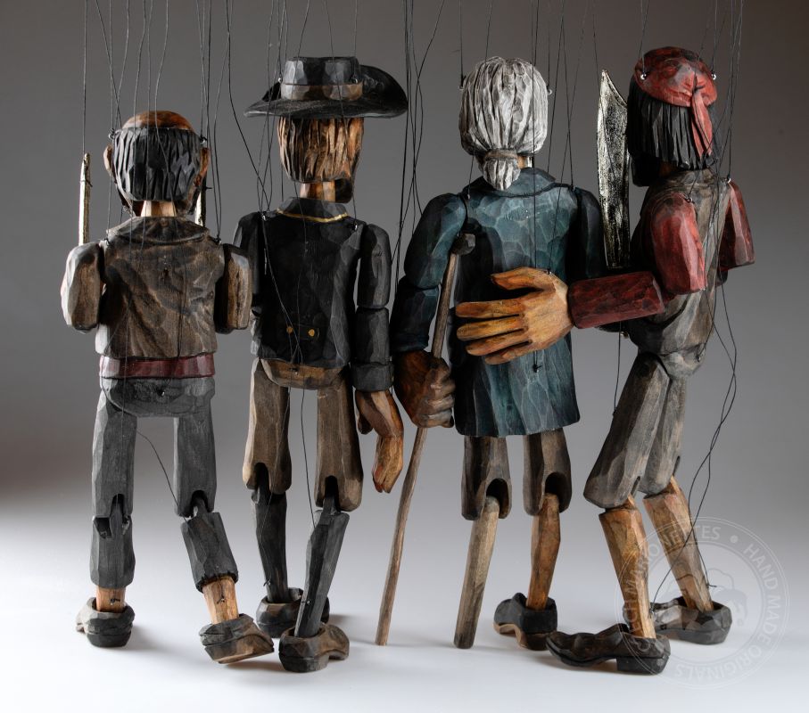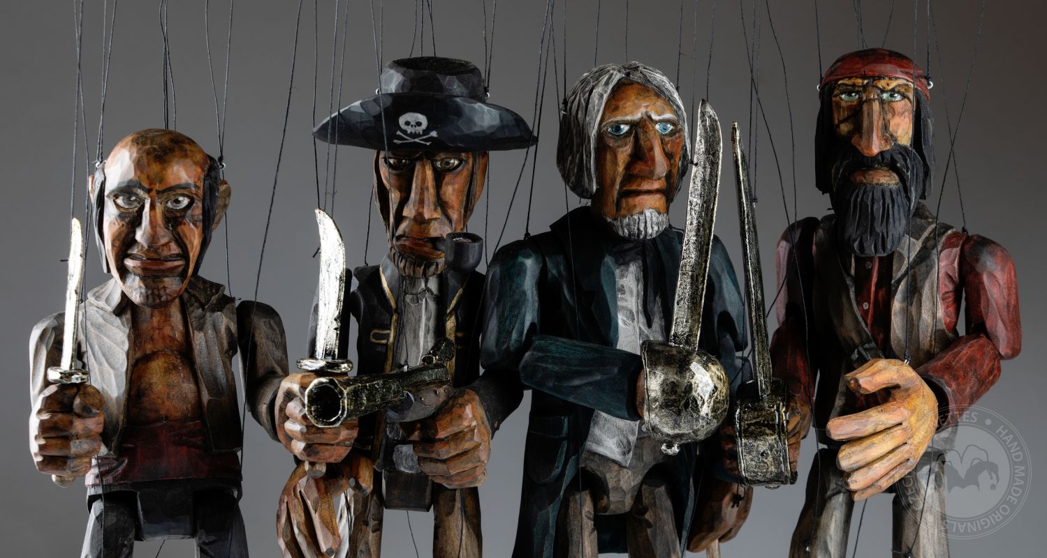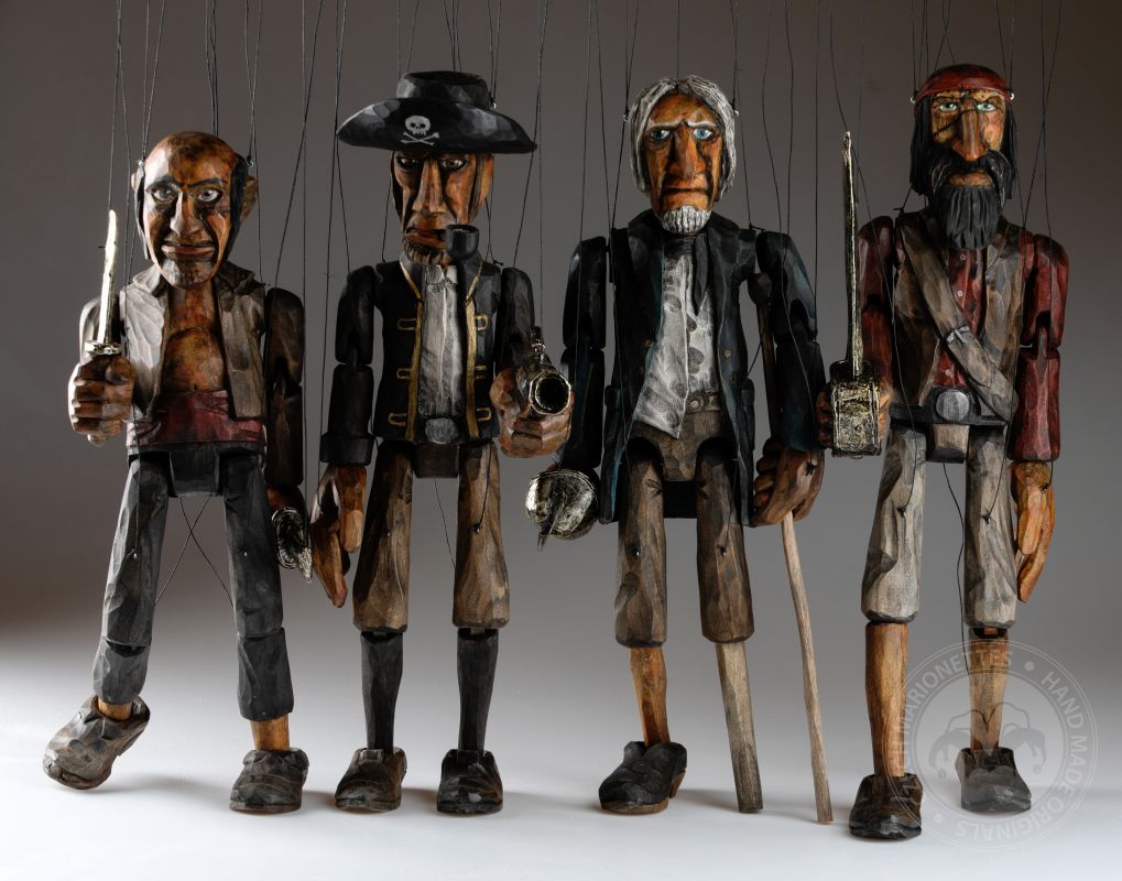 Préparez-vous pour l’aventure avec cette collection exclusive de marionnettes de pirates sculptées à la main, chacune apportant sa personnalité unique à bord !