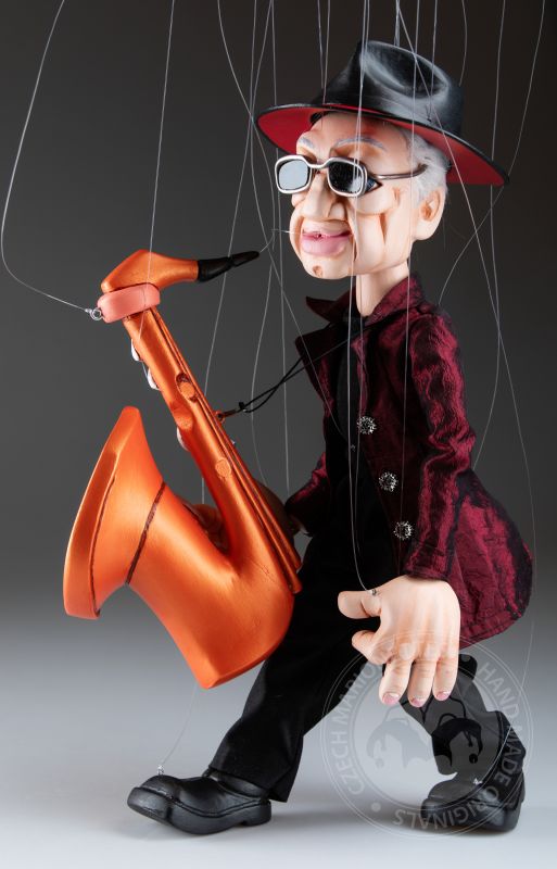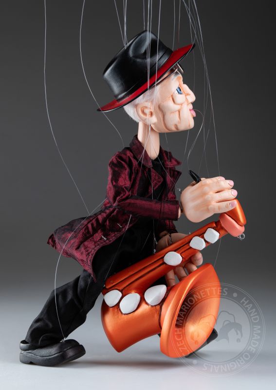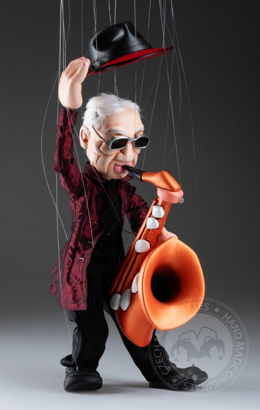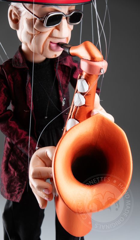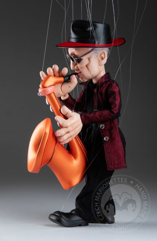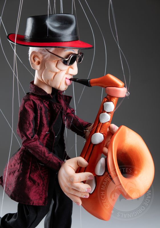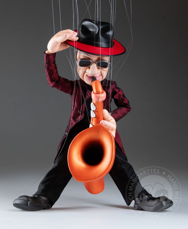 Vêtue d’un manteau texturé rouge profond, d’une tenue noire et d’un chapeau emblématique avec des lunettes élégantes, elle incarne le charme d’un véritable artiste. Son saxophone en bois détaillé ajoute une touche dynamique, faisant de cette marionnette non seulement un magnifique objet de collection, mais aussi un hommage à la culture jazz.