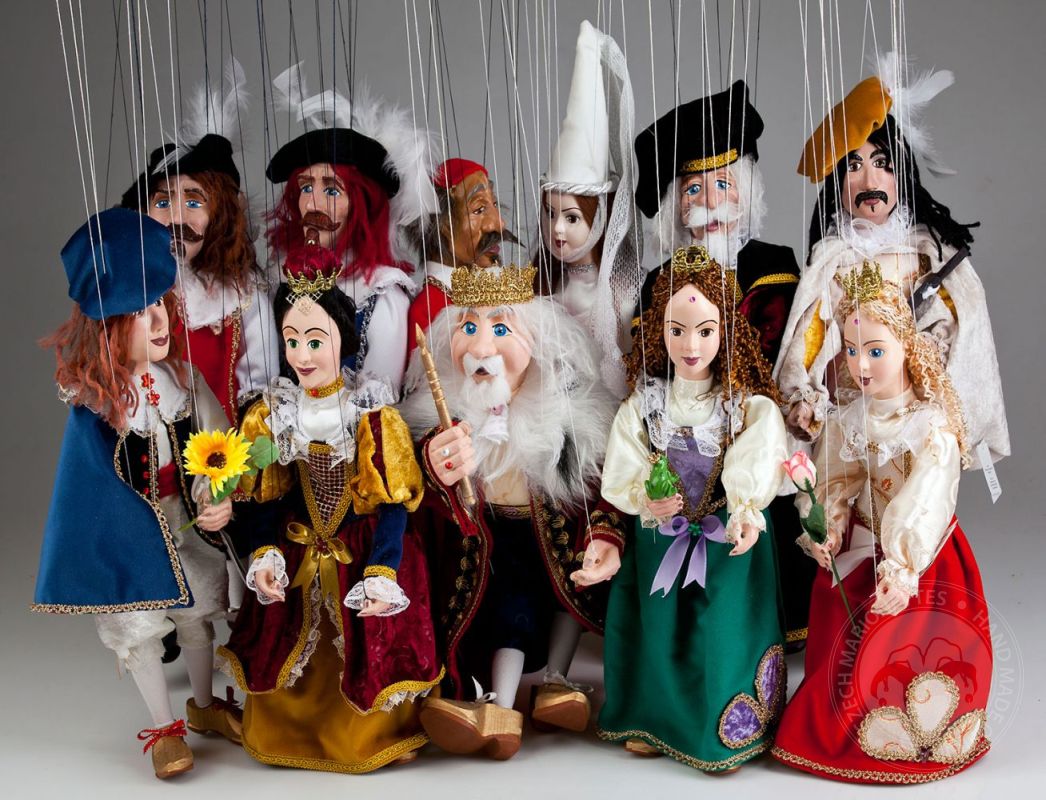 La collection comprend : Marionnette du Roi, Marionnette de la Reine, deux Mousquetaires, un joueur de Ukulélé, une Marionnette du Prince, deux magnifiques Princesses, un Enseignant, un Cardinal, et la Marionnette magique de la Dame Blanche.