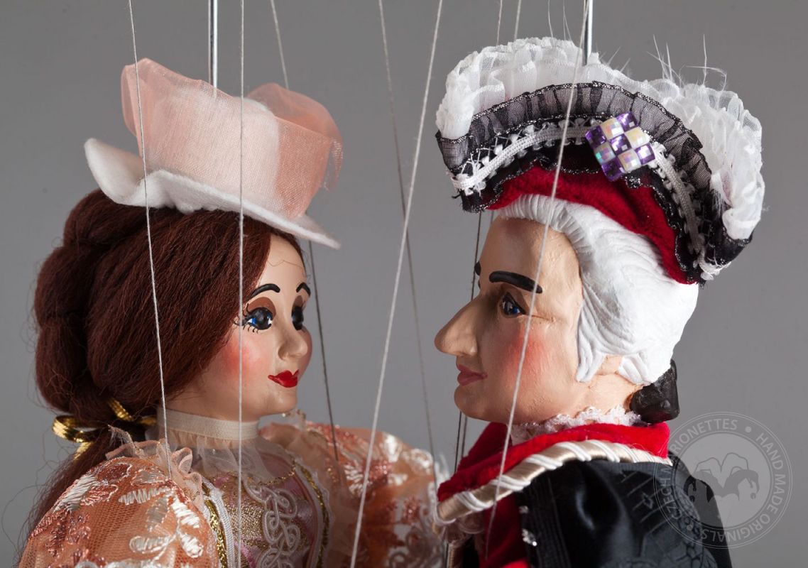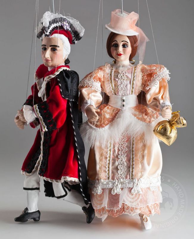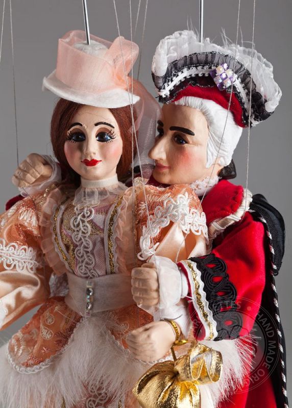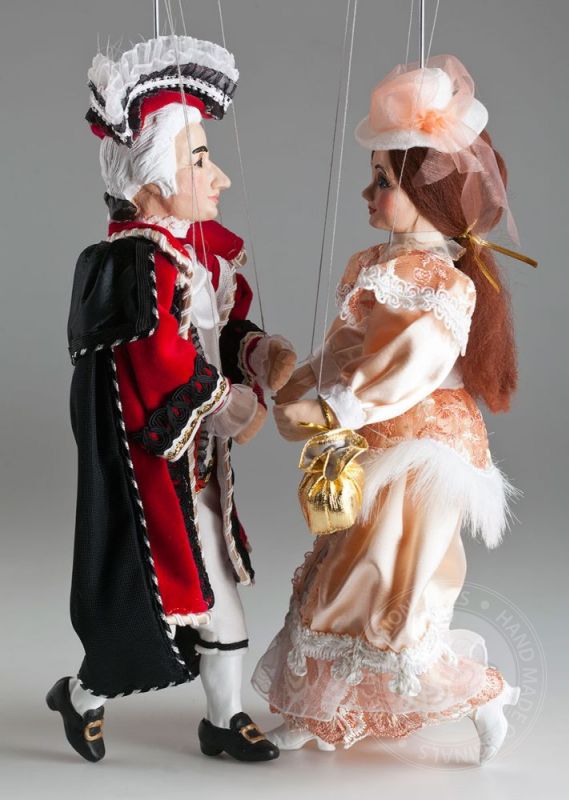 Les vêtements flamboyants évoquent l'atmosphère de la saison des bals. Les costumes cousus à la main sont élaborés dans les moindres détails, tous les volants et dentelles complètent astucieusement l'atmosphère baroque, l'époque qui favorisait le plus les spectacles de bal et théâtraux. Le baroque est aussi la période où le théâtre de marionnettes s'est développé - non seulement les nobles voulaient assister à des spectacles, les marionnettes étaient donc une alternative moins chère au théâtre pour le grand public.Ces marionnettes sont produites en éditions limitées de quelques pièces. La tête, les mains et les pieds sont moulés et peints à la main, le corps (squelette) est en bois de tilleul. La marionnette a un contrôle traditionnel, elle est reliée à la bascule par un fil solide, et des fils classiques sont utilisés pour contrôler les mains et les pieds.Découvrez le travail magnifique et détaillé sur les magnifiques costumes sur mesure. Ils sont fabriqués à partir de matériaux de haute qualité et mettent l'accent sur un traitement précis. La haute ornementation est absolument typique de cette collection.