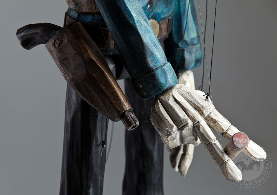 Cette marionnette est sculptée à la main dans du bois et c'est une véritable œuvre d'art. Une marionnette absolument unique de l'un de nos meilleurs artistes. Le dispositif de commande lui permet une large plage de mouvement et convient également aux performances professionnelles. Notre marionnette Cowboy aura fière allure dans chaque intérieur par elle-même ou vous pouvez faire une grande collection avec les autres marionnettes de l'autre côté.