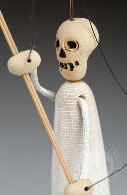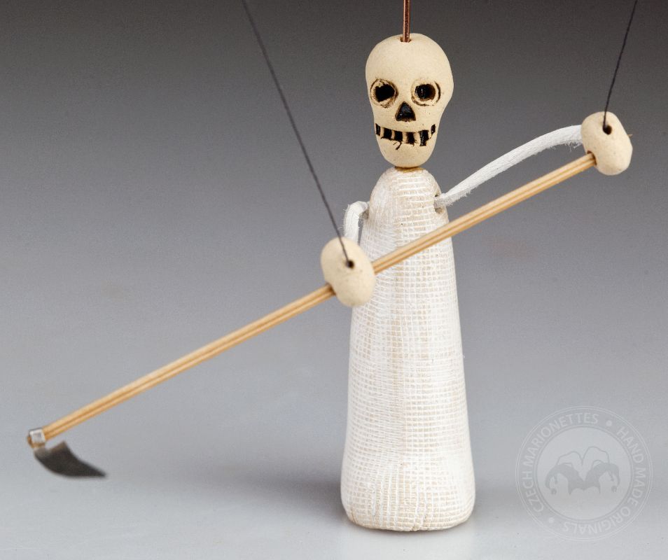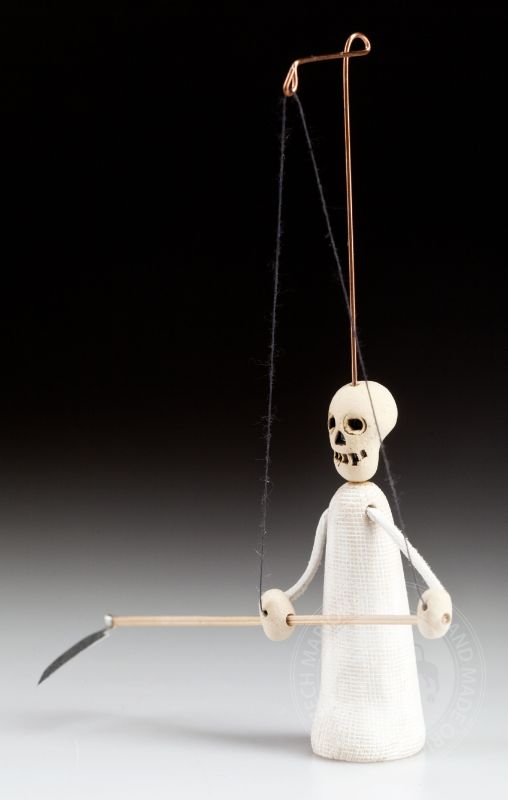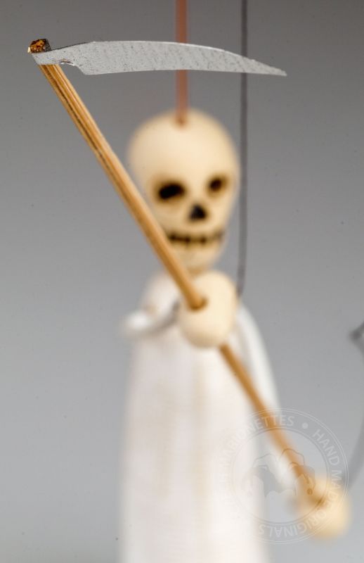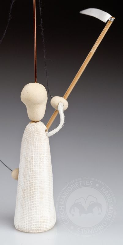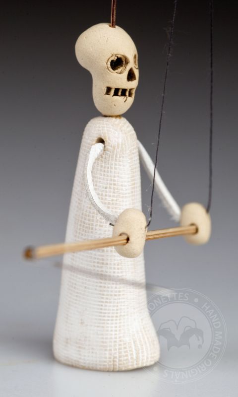 Chaque collection a besoin d'un personnage effrayant et nous avons donc la marionnette Mort. Il n'est pas forcément effrayant. Il est principalement légitime et tellement nécessaire dans ce monde. Comme vous pouvez le voir, il porte sa faux avec lui tout le temps et est conçu dans des tons de blanc et de beige. La tête a une forme de crâne parfaite, vous ne pouvez donc pas le confondre avec quelqu'un d'autre. Cette jolie petite marionnette est fabriquée à la main en céramique. L'artiste a mis tout le soin et le savoir-faire nécessaires pour créer une petite marionnette unique.