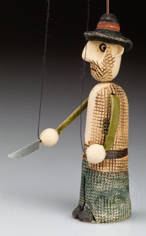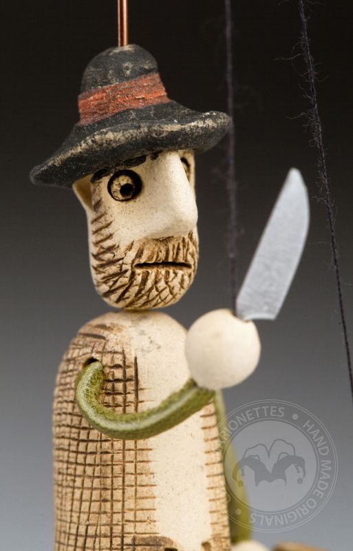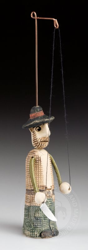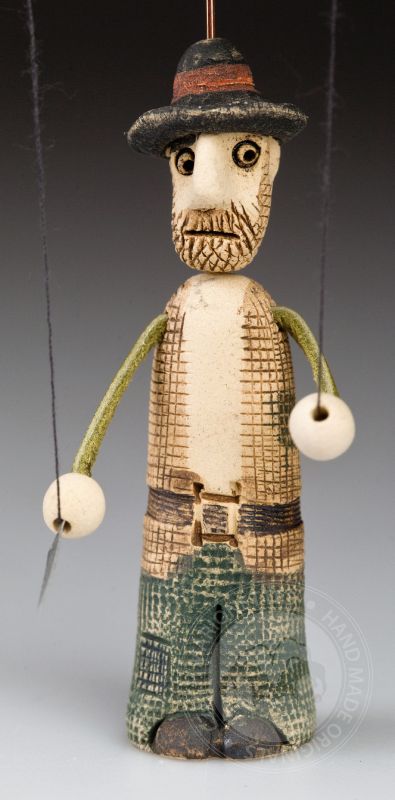 Ce mec est toujours en train de préparer quelque chose. Pas étonnant, c'est un brigand! Assaisonné, rugueux et effronté en effet. Notre marionnette Brigand reflète tous les attributs ci-dessus. De plus, il est fait comme une minuscule figurine qui vous remontera le moral peu importe ses manières. Ses vêtements ont de merveilleuses couleurs terreuses et il a un chapeau élégant lui donnant une ambiance cool. Cette marionnette est fabriquée à la main en céramique. Petite œuvre d'art très unique.